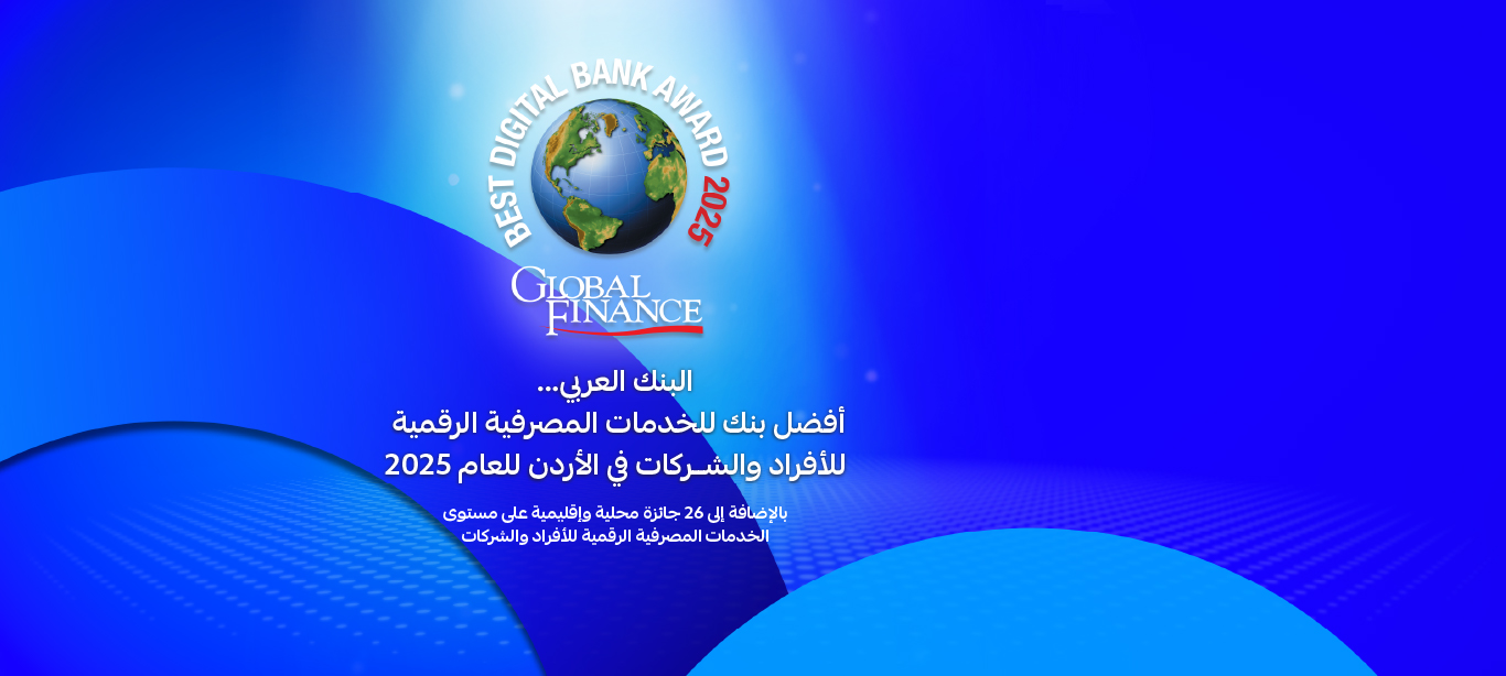 البرامج إيليت هي خدمة مصرفية شخصية فريدة تم تصميمها خصيصاً لتلبية احتياجات عملائنا المميزين حيث ستلمس الفرق... البطاقات تواصل دائم مع حساباتك والعديد من المزايا القروض مع القرض الشخصي من البنك العربي فان تحقيق طموحاتك و أحلامك هو أسهل من أي وقت... الحسابات لتقديم الطلبات، يمكنكم: - تعبئة نموذج الطلب الإلكتروني - زيارة أي من فروعنا المنتشرة عبر المملكة (اضغط... الحلول التأمينية برامج ادخارية لتأمين الاقساط الجامعية خدمات التحويل لمزيد من المعلومات يرجى الاتصال بمركز خدمة العملاء على الرقم 4600900 او 0791600900 . صناديق الأمانات مع خدمة صناديق الأمانات إنعم براحة البال وأحفظ مقتنياتك الثمينة مهما تنوعت من مجوهرات،وثائق، سبائك ذهبية... المنتجات والخدمات الصديقة للبيئة يقدم البنك العربي باقة من المنتجات والخدمات الصديقة للبيئة التي تم تصميمها لتمنحك فرصة المساهمة في... برنامج نقاط العربي برنامج نقاط العربي هو برنامج ولاء قائم على علاقة العملاء من البنك العربي يمنحك نقاطاً بناءً... إدارة الثروات نضع احتياجاتك وأهدافك في مقدمة أولوياتنا، لذا يقدم لك البنك العربي مجموعة مختارة من حلول إدارة... عربي موبي كاش تطبيق الدفع الجديد من البنك العربي "عربي موبي كاش" يتيح لكم دفع قيمة مشترياتكم ... إي توفير بلس نقدم لكم حساب " إي-توفير بلس" الكل ربحان، كل يوم! اكتشف طريقة جديدة للتوفير مع... عربي هيلث يعلن البنك العربي عن إطلاق خدمة Arabi Fitness من خلال تطبيق عربي موبايل بالتعاون مع تطبيق... عربي اي-تداول خدمة “عربي إي-تداول” هي خدمة حصرية لعملاء البنك العربي الحاليين والتي سيتمكن العميل من خلالها التقدم... تطبيق "جونير" منقدملكم تطبيق "جونيَر" الجديد والمصمّم خصيصاً للأطفال واليافعين حتى عمر 18سنة، لتعلّم ابناءك المسؤولية في إدارة... -